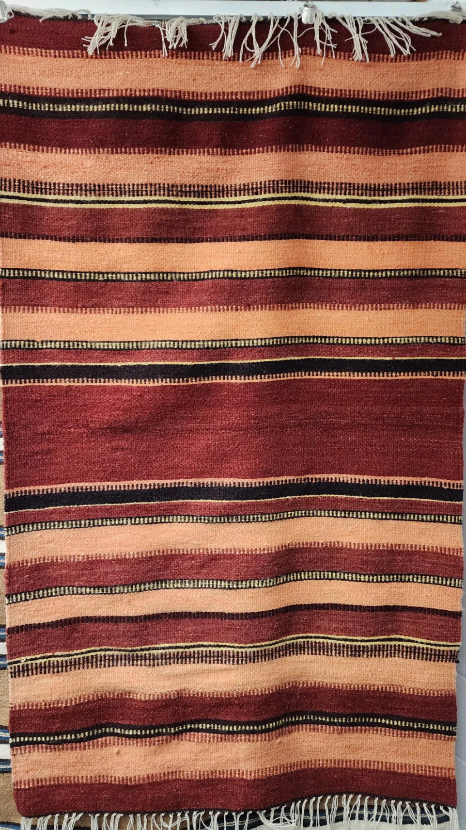 This type of handwoven wool blanket is commonly used as a wall hanging, or draped over furniture. This piece has natural dyed orange as a background color and red, yellow, and natural black included in its design. It uses hand-spun churro wool and natural dyes, which means that yarn in this piece uses dyes that were obtained from flowers, leaves, wood, or insects. It was woven by Beatrice Maestas who is a long-time spinner, weaver, colcha embroiderer and Spanish Market artist. Is It measures approximately 36 by 72 inches.